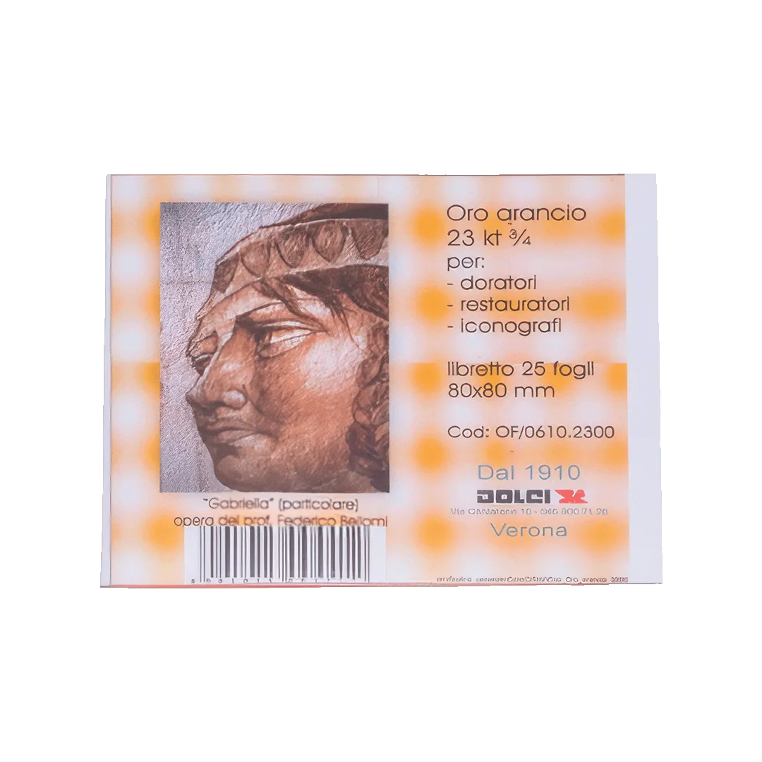 La confezione contiene 25 fogli di Oro Arancio 23¾ Kt, formato 80×80 mm, realizzati in oro quasi puro, con tonalità calda aranciata. Questo tipo di oro è particolarmente indicato per restauro conservativo, dorature di pregio su legno, gesso, metallo o superfici preparate e per decorazioni artistiche di alta qualità.