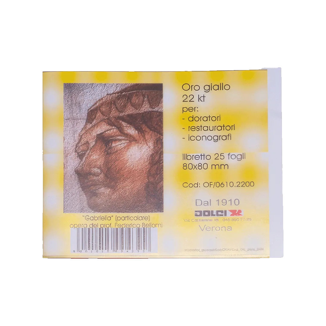 La confezione contiene 25 fogli di Oro Giallo 22 Kt nel formato 80×80 mm, realizzati in oro vero ad alta purezza, caratterizzato da una tonalità giallo caldo intensa e naturale.