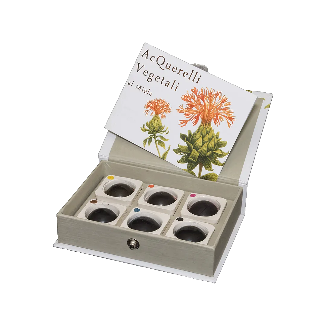 Gli Acquerelli Vegetali al Miele di Marco Fantuzzi sono prodotti artigianalmente con la massima cura, utilizzando pigmenti naturali e miele di acacia come legante. Questo set completo comprende 6 colori vegetali e 1 di origine animale, selezionati per la loro purezza e brillantezza: