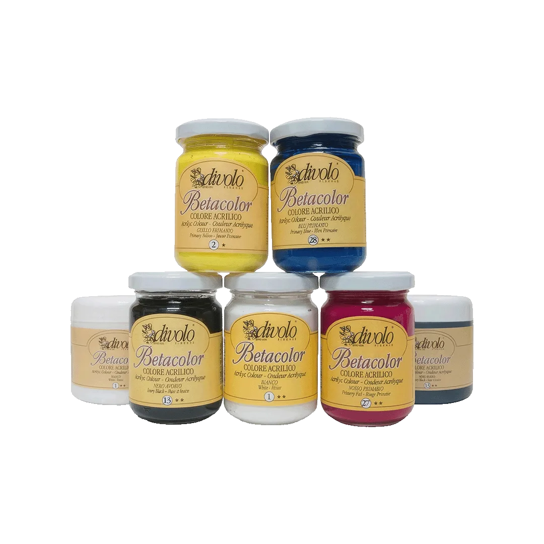 I Colori Acrilici Betacolor Divolo sono formulati con pigmenti selezionati e resine acriliche di qualità, per garantire tonalità intense, buona coprenza e facilità di utilizzo. La consistenza morbida e omogenea consente una stesura fluida sia a pennello che a spatola, permettendo di realizzare campiture uniformi, velature o effetti materici.