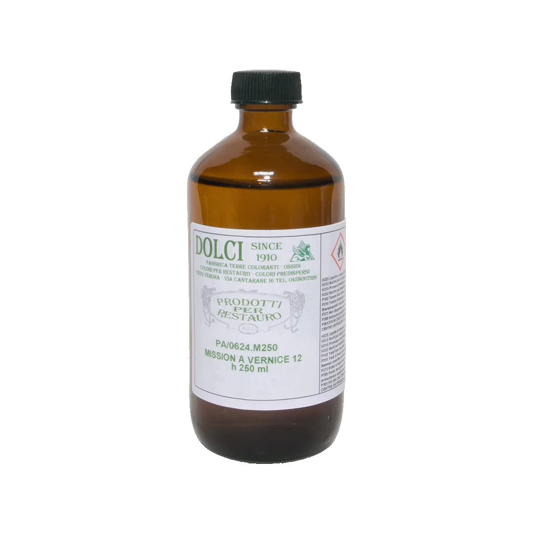 La missione si presenta come liquido oleoso ambrato, con odore caratteristico di trementina, insolubile in acqua e composto da oli naturali in essenza di trementina. L’applicazione avviene con pennello piatto sulla superficie preventivamente lisciata o spazzolata. Dopo 3-12 ore di essiccazione al riparo dalla polvere, il prodotto diventa appiccicoso al punto giusto per ricevere la foglia. Eventuali residui si rimuovono facilmente con essenza di trementina.