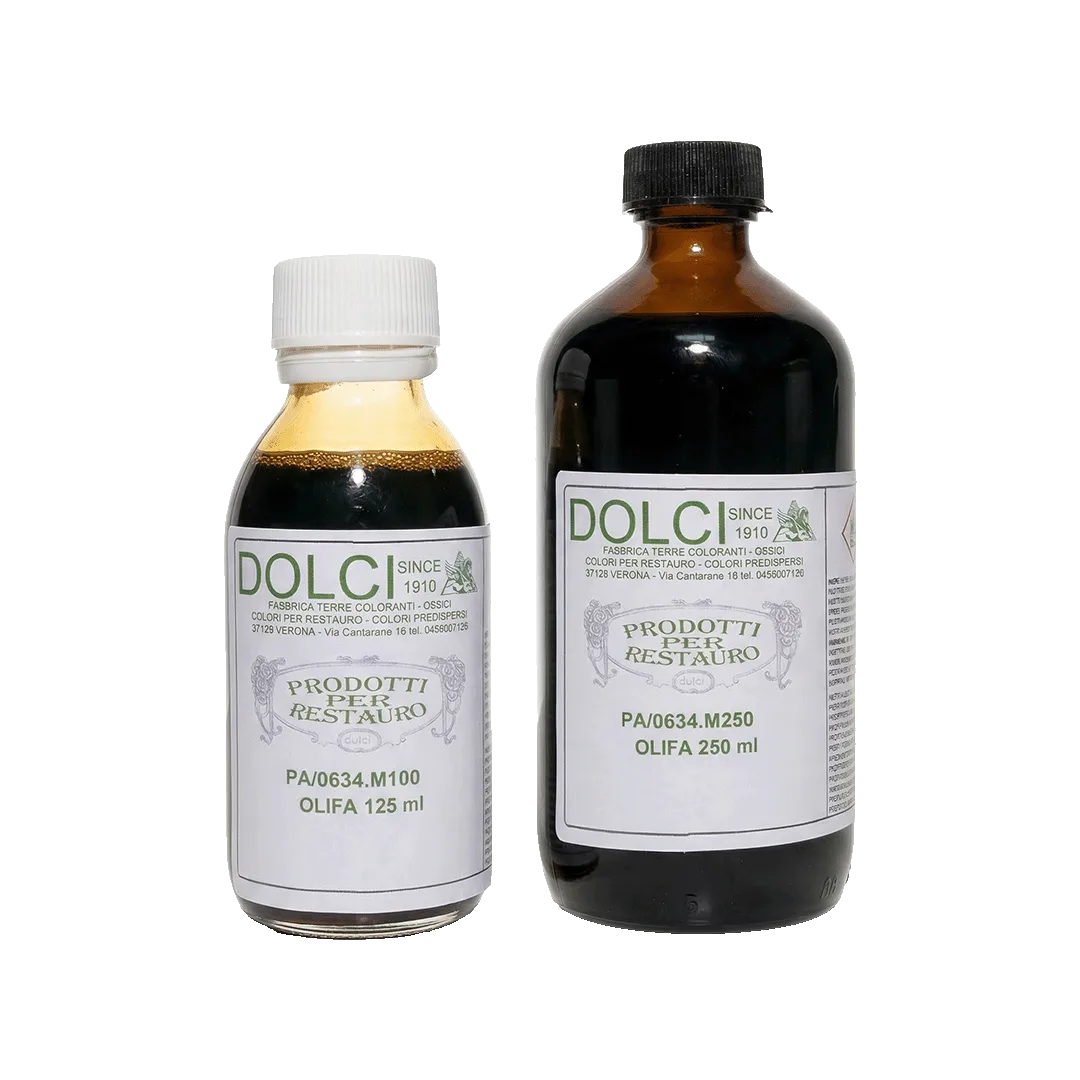 L’Olifa è un olio di lino siccativo, tradizionalmente utilizzato per proteggere tavole e supporti pittorici e per migliorare l’adesione dei colori a olio. Può essere usata già pronta, con essiccazione lenta (circa 6 mesi), oppure arricchita con essicativi naturali come acetato di cobalto o minio di piombo, riducendo l’asciugatura a 3-4 giorni.