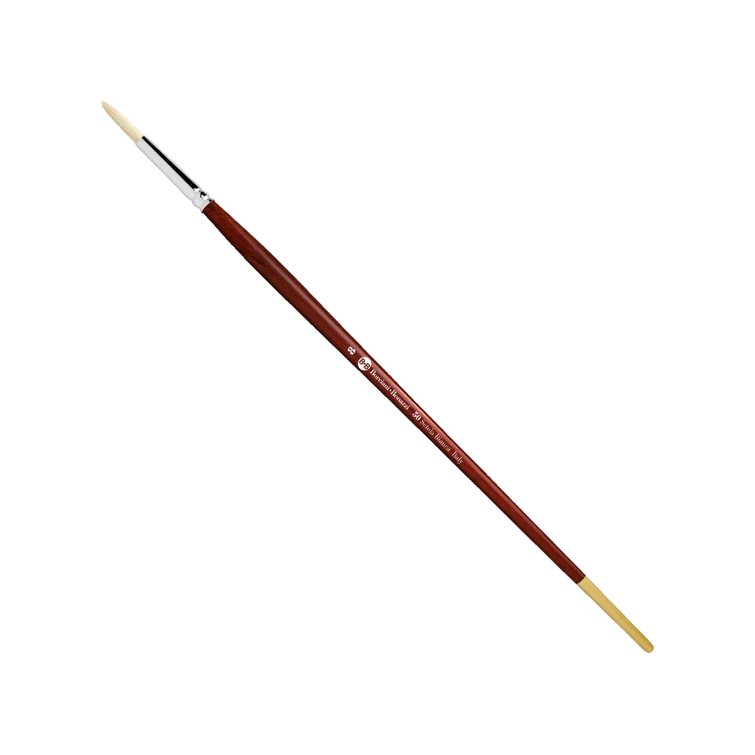 Il Pennello Tondo Serie 50 è realizzato con setola bianca naturale, apprezzata per la sua resistenza, elasticità e capacità di trattenere una buona quantità di colore. È particolarmente indicato per tecniche che richiedono carico del pigmento e stesure strutturate, garantendo una pennellata decisa e controllata.
