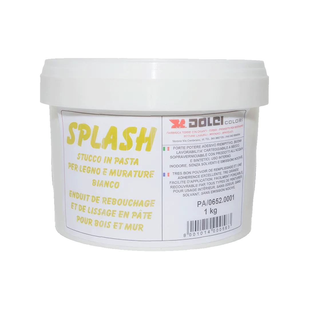 Splash Stucco in Pasta permette di correggere le imperfezioni dei supporti: buchi, angoli rotti, crepe. Ha un notevole potere riempitivo, forza adesiva e buona lavorabilità, anche con carteggiatura a secco. Può essere sovraverniciato sia con prodotti all’acqua che con prodotti contenenti solventi sintetici, senza incorrere in fenomeni di rimozione o eccessivi assorbimenti.