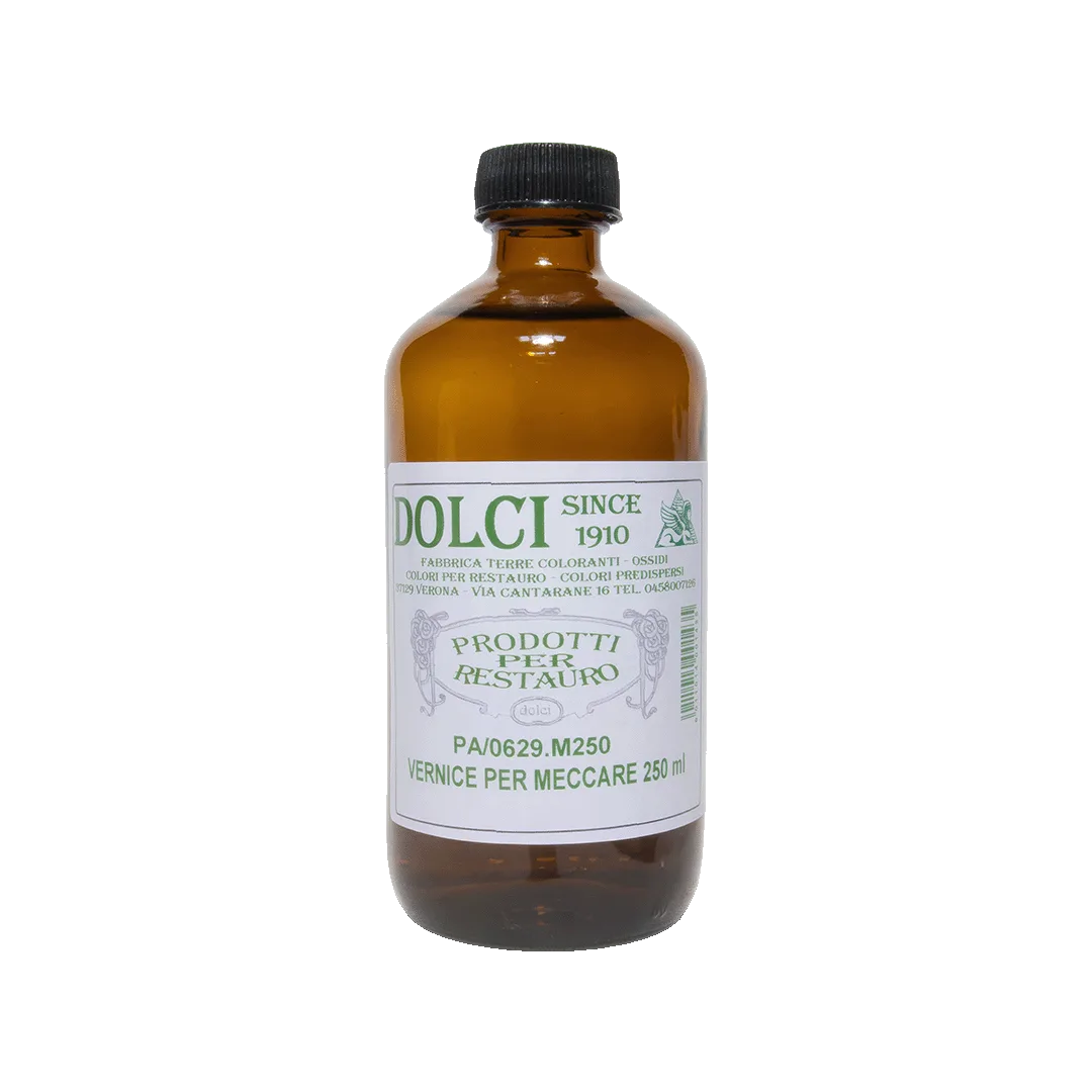 La vernice “Mecca” è una soluzione alcolica di gomma lacca e coloranti. Si utilizza per colorare e proteggere le superfici dorate e argentate.